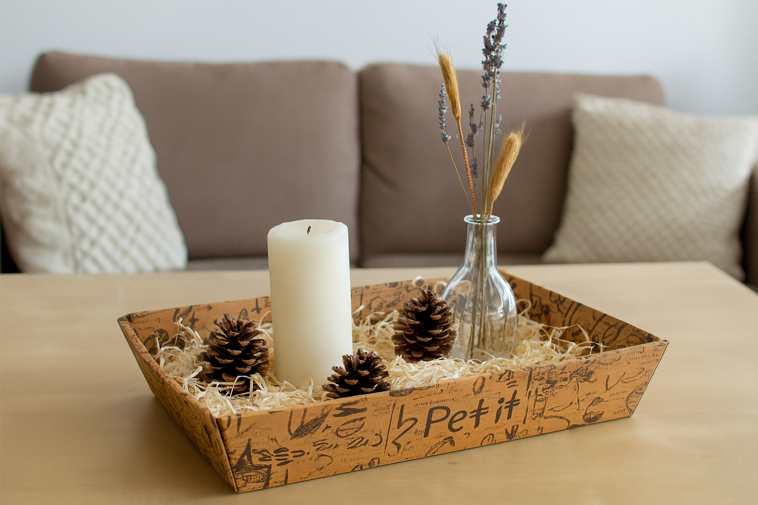 Una bandeja de madera sobre una mesa de comedor, cocina o centro del salón es la base perfecta para un centro decorativo. Puedes añadir velas, jarrones pequeños, piñas, flores secas o viruta decorativa. Cambia los elementos según la estación del año para tener una composición viva y cambiante.