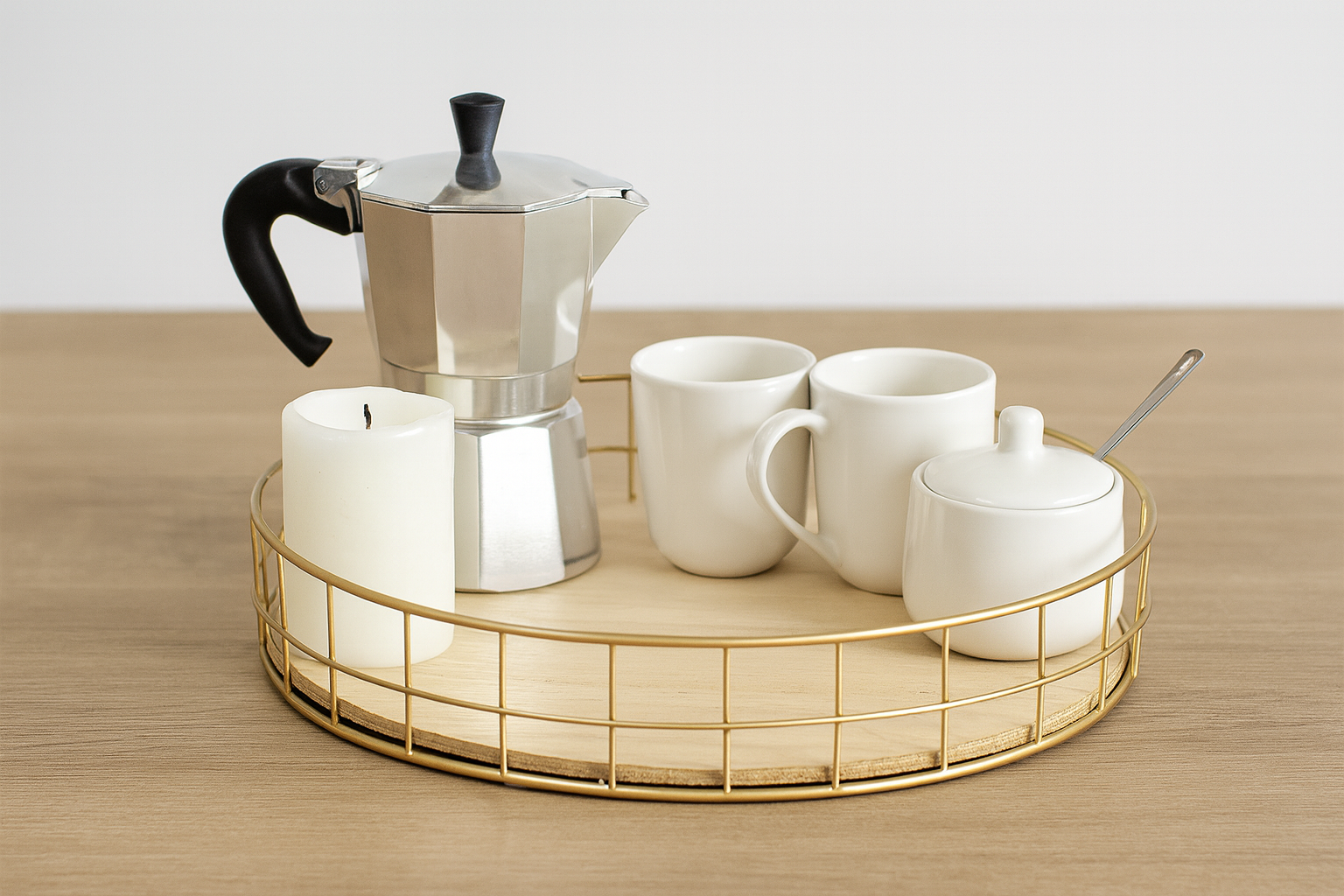 Crea tu pequeño ritual diario con una bandeja donde tengas todo lo necesario: la cafetera, tazas, azucarero, una cucharita y una vela. Ya sea en la cocina o en una mesita auxiliar, un coffee corner organizado con bandeja es funcional y acogedor.