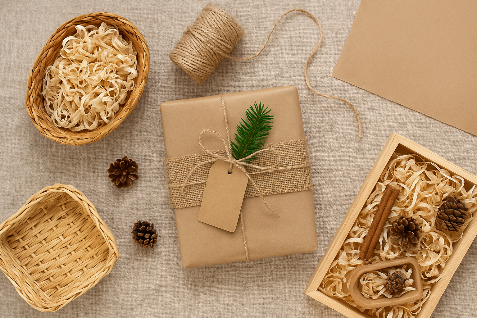 La viruta decorativa es un clásico del packaging ecológico. Sirve para proteger los productos, rellenar huecos y dar un aspecto cálido al interior de la caja o cesta. Puedes elegir tonos naturales o neutros para mantener la estética más sobria, o incluso combinarla con colores tierra o dorados para un toque más festivo.