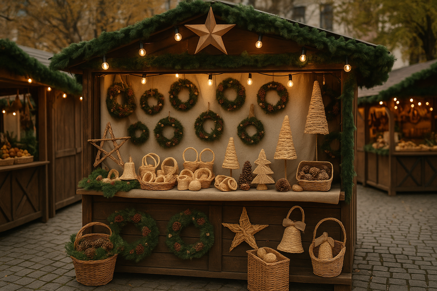 Si estás preparando un evento de este tipo, cuidar la decoración artesanal es clave para atraer al público y reflejar autenticidad. La tendencia actual se aleja de los adornos sintéticos y los colores estridentes, apostando por materiales naturales como el mimbre, la madera, la viruta o la tela de yute, que transmiten calidez, sostenibilidad y tradición.