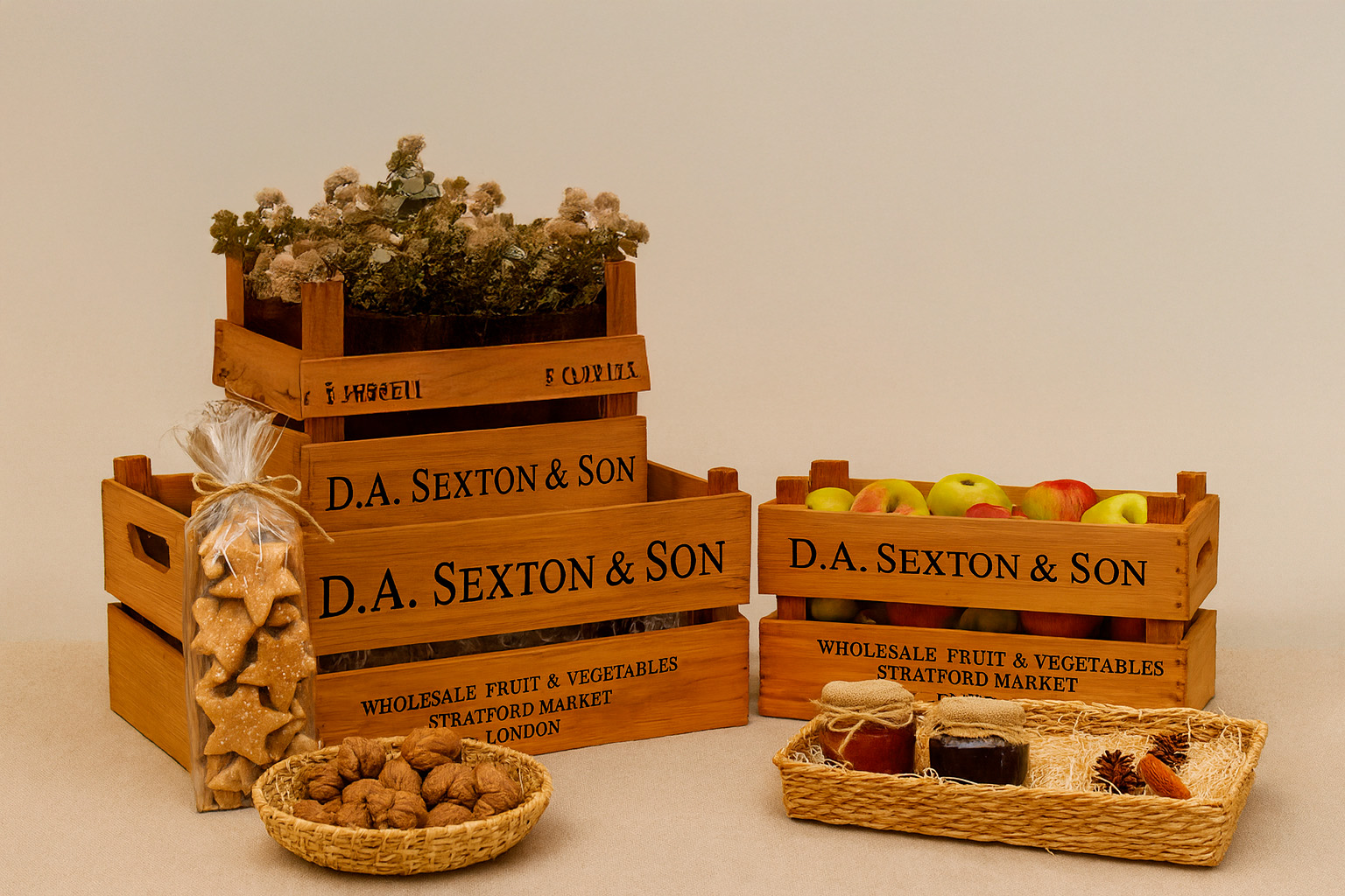 Cestas grandes con productos naturales, cajas de madera con viruta y etiquetas hechas a mano. Usa materiales reutilizables para transmitir valores de cercanía y respeto por el entorno.