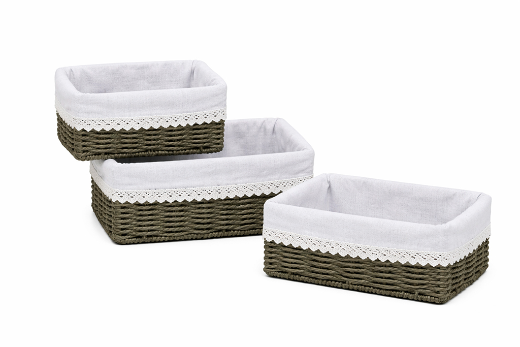 Dreier-Set mit Kreideschubladen. Sein Innenraum ist mit einem abnehmbaren grünen Stoff mit Blumendruck und Spitzendetails ausgekleidet. Dieser Korb kann zum Dekorieren des Hauses mit kleinen Accessoires, als Behälter für Geschenksets oder als Schubladenelement in Schränken verwendet werden.