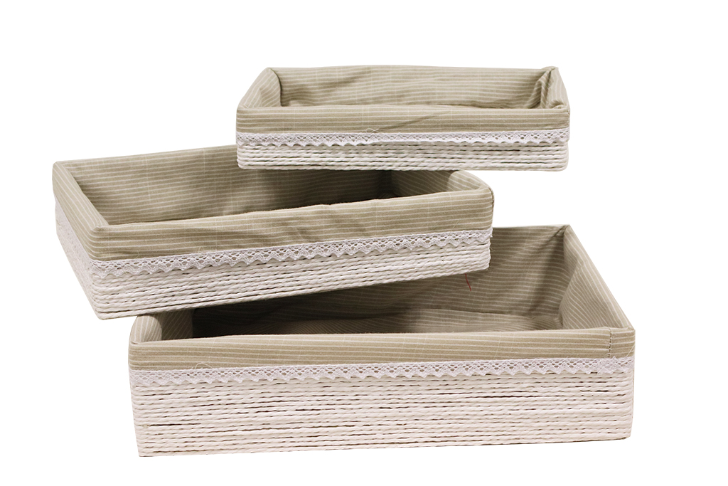 Schubladen aus weißen Papierstreifen auf Karton. Sein Inneres ist mit einem abnehmbaren blaugrauen Stoff mit weißem Sternendruck ausgekleidet. Dieser Korb kann verwendet werden, um das Zuhause mit kleinen Accessoires zu dekorieren, als Verpackung für Geschenksets oder als Kommode in Schränken zu verwenden. MASSNAHMEN: 42*31*10 / 37*26*8 / 32*21*6