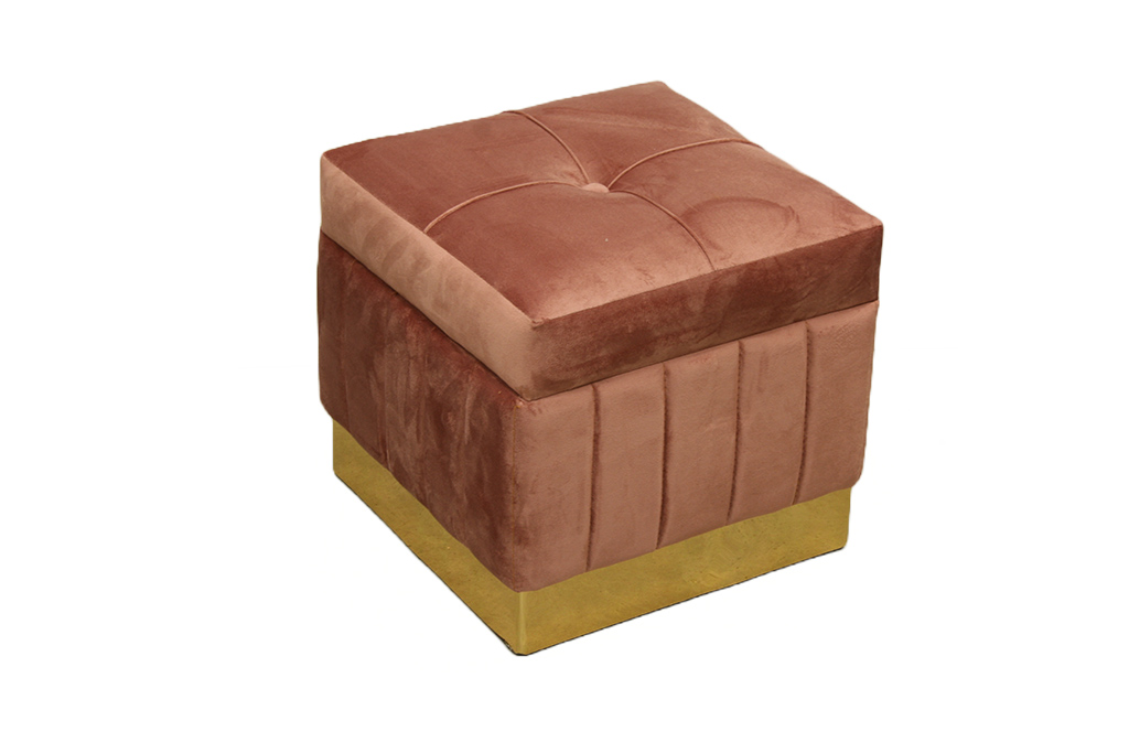 Wooden pouf covered in velvety fabric in salmon color. With golden legs.