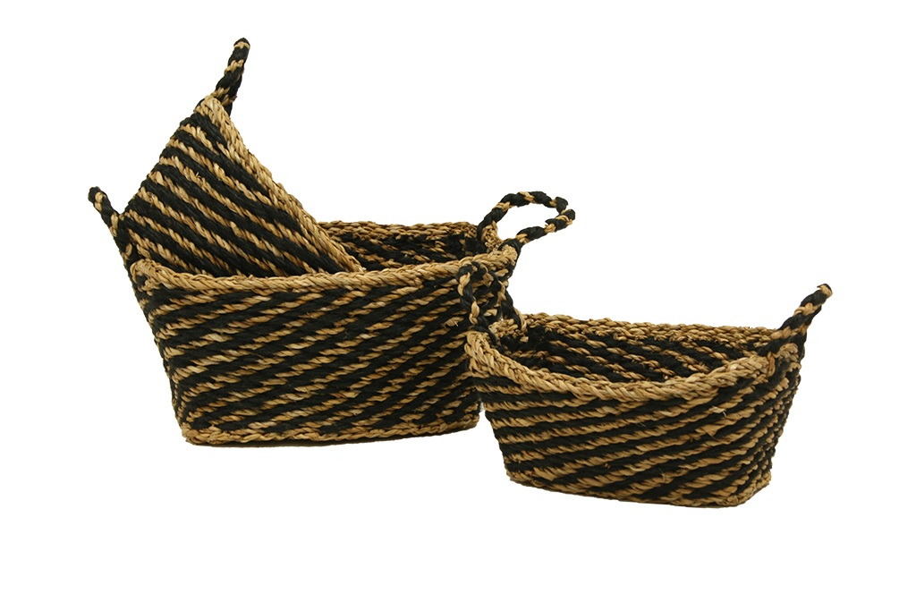 Set composed of three baskets made with jute. These baskets feature a rustic and traditional design. Each one has two handles on the sides for easy handling and transportation. By having different measurements, they allow for a multitude of uses at home or in businesses. It can be used as a container to present products such as fruit or nuts in public-facing locations.
