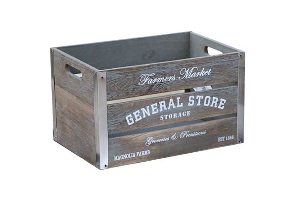 Light gray wooden box, has a modern design with a retro air. On the front it has the inscription "General Store" in white. It has two handles on the sides for transport and handling. The metallic edges on each side stand out. This wooden box is ideal for home storage and organization. It can also be used to create bundles of products for gifts or to display products in stores. Measurements: 35*23*21cm