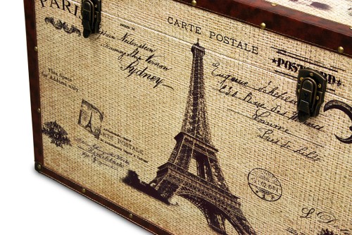 Wooden trunk lined on the outside in imitation leather with retro Paris Effiel Tower motifs. Inside it is lined with black fabric, with two hardware for closure.