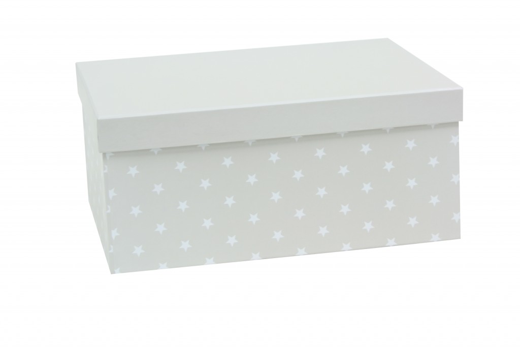 Box made of light gray cardboard, with white star print around the body of the box. The lid is plain gray. This box is perfect for storing our most precious accessories and memories. It also serves as a container or box for a gift. Thanks to its star print, this box is also widely used in gifts for babies and children.