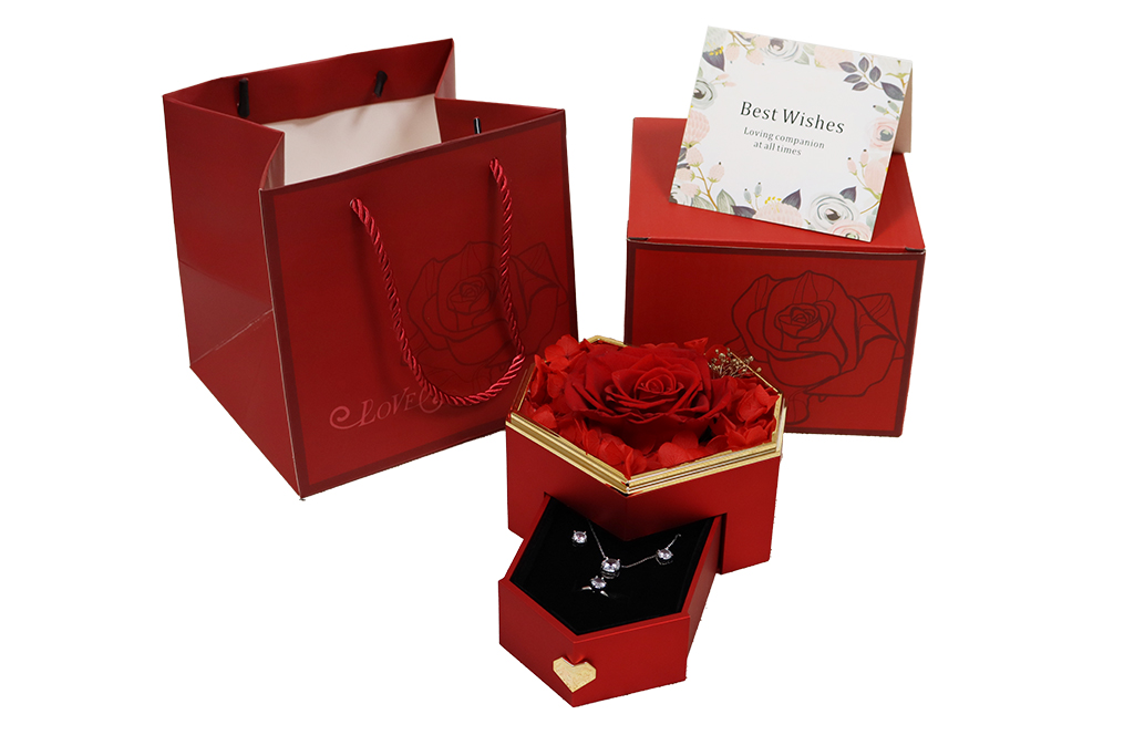 The red preserved rose jewelry box is an elegant and functional gift. It includes a preserved red rose and a jewelry box with space to hang a pendant and store a ring and earrings. Perfect for gifting on special occasions or as a unique gesture. Its delicate design makes it great for organizing jewelry or surprising a loved one. Includes a ring, earrings, and pendant, making it a complete gift for any occasion.