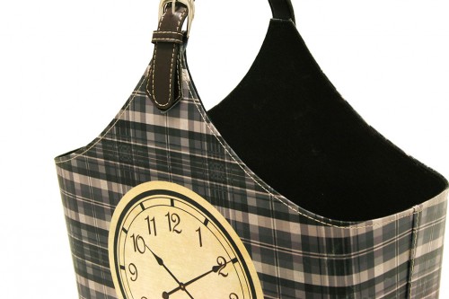Magazine rack or box for magazines with a clock design and checkered background, it has a handle on the top for its handling, with a belt buckle detail. Large capacity and sturdy, ideal for placing on the floor with magazines, office or home files, etc. Measurements: 43x22x37 cm.