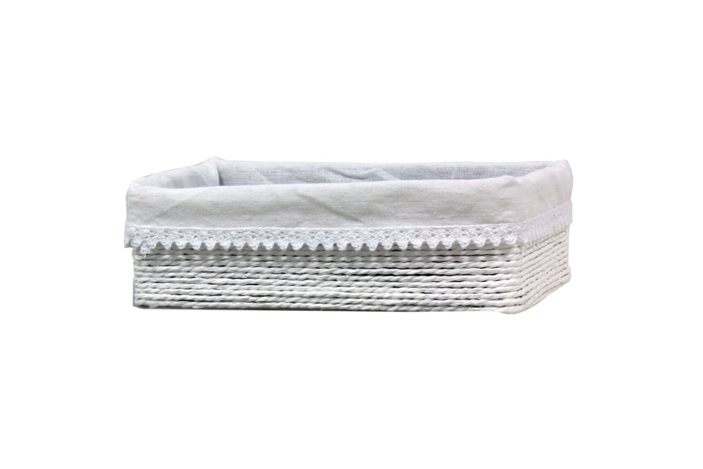 Chest of drawers made with strips of white paper on cardboard. Its interior is lined with a removable white fabric with lace detail. This basket can be used to decorate the home with small accessories inside, as a container for gift sets or to use as a drawer unit in closets.