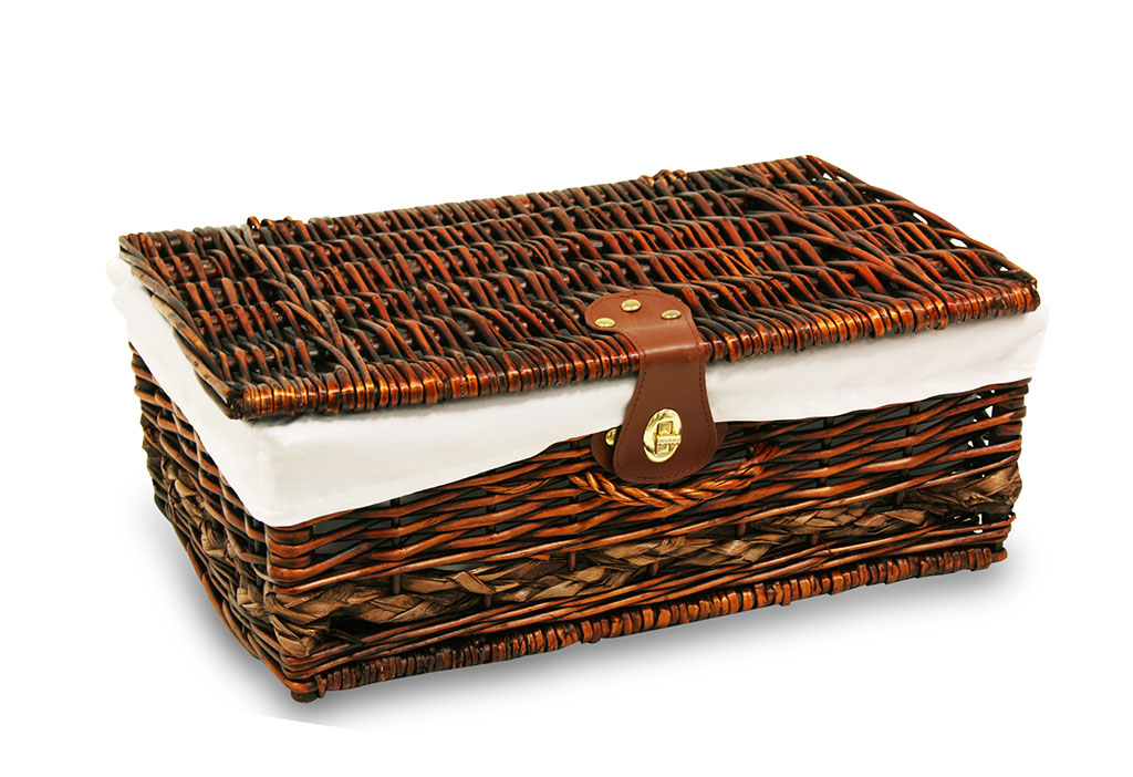 Dark brown wicker suitcase with lid and leather safety closure. Its interior is lined with beige fabric that can be removed for washing. This suitcase can be used to create lots of gift products or to store accessories or food both at home and in shops. Measurements: 43x30x17 cm