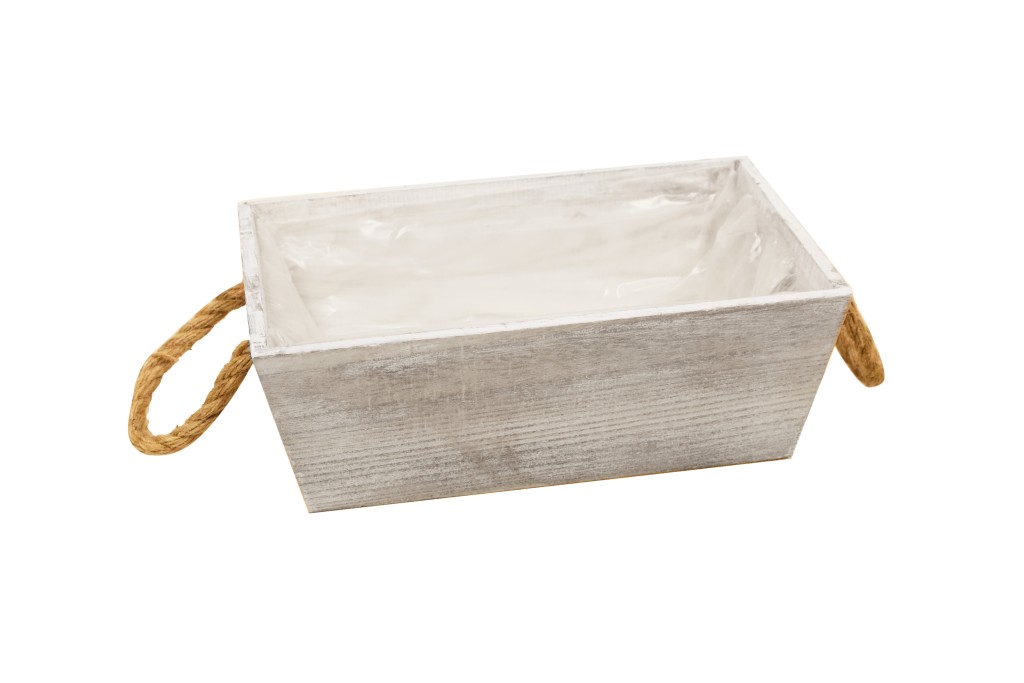 The wooden planter with rope handles combines functionality and rustic style in a single piece. Made of durable wood and decorated with natural rope handles, this design is ideal for transporting and displaying plants, flowers, or decorative arrangements. Its plastic-lined interior protects the wood and makes it easy to use with live plants.