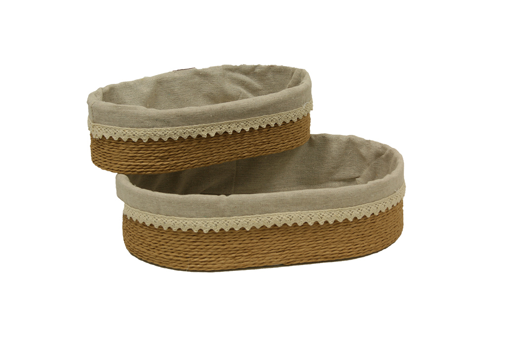 Paniers ou plateaux ovales réalisés avec des bandes de papier beige sur carton. Son intérieur est doublé d'un tissu amovible de la même couleur avec détail de dentelle. Ce panier peut être utilisé pour décorer la maison avec de petits accessoires à l'intérieur, comme contenant pour des coffrets cadeaux ou comme meuble à tiroirs dans les placards.