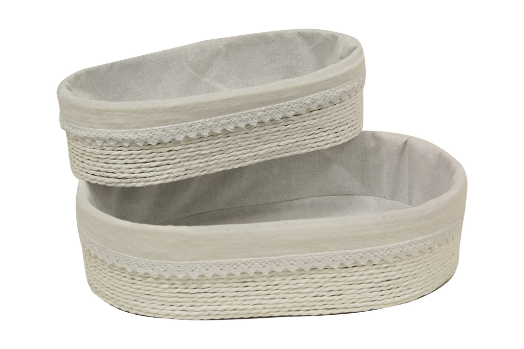 Paniers ou plateaux ovales fabriqués à partir de bandes de papier blanc sur carton. Son intérieur est doublé d'un tissu blanc amovible avec détail en dentelle. Ce panier peut être utilisé pour décorer la maison avec de petits accessoires à l'intérieur, comme contenant pour des coffrets cadeaux ou comme meuble à tiroirs dans les placards.