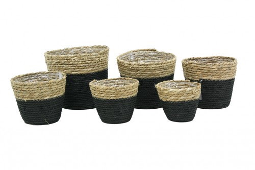 Ensemble de six paniers tressés avec jacinthe d'eau, ils ont deux couleurs, la partie supérieure est marron et la base est blanche. Cet ensemble sera idéal pour décorer la maison avec des fleurs, car son intérieur est recouvert de plastique. Ces paniers sont à la mode, étant écologiques ils apportent beaucoup de naturel à la pièce dans laquelle ils se trouvent. Dimensions : 24*22*19 / 22*20*17 / 20*18*15 / 19*16*13 / 17*15*11 / 15*12*9.5 cm