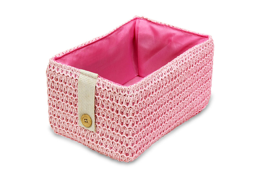 Cajonera de forrada de tela en color rosa, por fuera la tela es con diseño de bordados y por dentro en tela lisa. Esta disponible en 4 colores.