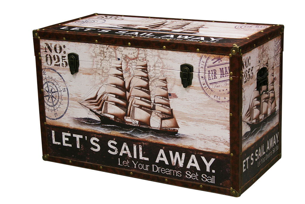 Los baúles de madera se convertirán en indispensables para ti. Ya que además de ser un cómodo sistema de almacenaje son perfectos para la decoración de cualquier estancia de nuestro hogar, por eso te presentamos el BAUL DECORACIÓN BARCO. Este baúl está fabricado con materiales de muy buena calidad, lo que se puede apreciar en sus preciosos acabados. Por fuera está forrado con poli-piel y por dentro con tela negra. Dispone de dos herrajes y una cubierta abatible para poder cerrarlo. Su diseño es muy original tanto en la parte frontal como en la cubierta del baúl aparece un antiguo navío , así como diversos iconos relacionados con los viajes y las largas travesías marítimas. El baúl nos invita a navegar lejos "Let´s sail away" y a dejar volar nuestros sueños "Let your Dreams set sail". Este baúl es ideal para personas soñadoras y aventureras. Este baúl puede utilizarse para el almacenaje de todo tipo de objetos, como libros, CDS, ropa, sábanas. etc y además es un elemento decorativo ideal para cualquier estancia de nuestro hogar. MEDIDAS: 80*40*50 Disponible en otras medidas.