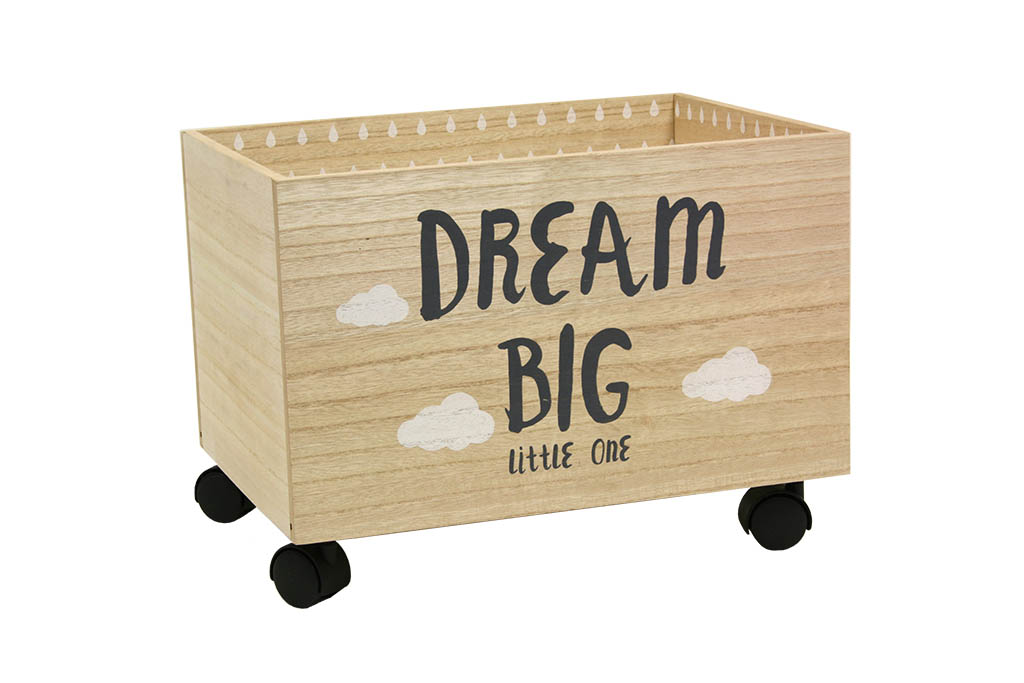 Caja de madera natural con cuatro ruedas. Su estilo es tradicional, imitando a las cajas antiguas. En la parte frontal tiene la inscripción Dream Big little one´ en color negro con estampado de nubes blancas alrededor. El interior de la caja tiene un estampado de estrellas blancas. Esta caja de madera es ideal para el almacenaje y organización de la habitación de los más pequeños de la casa, en ella podrán guardar libros, juguetes, peluches, entre otros. Medidas: 40*30*22 cm.