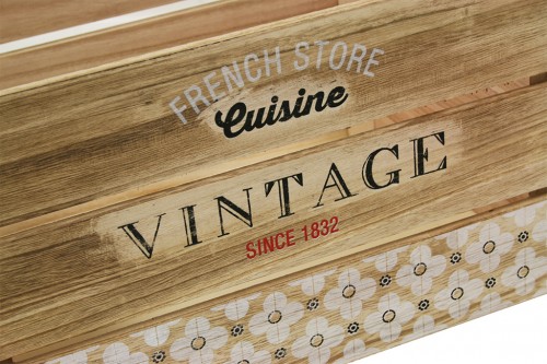 Caja de madera color marrón, de estilo tradicional, imitando a las cajas antiguas. En la parte frontal está decorada con seriegrafia roja y negra, y detalles florales en blanco . Esta caja de madera es ideal para el almacenaje y organización del hogar. También se puede usar para crear lotes de productos para regalo o para exponer productos en comercios o para colocar flores en el jardín, ya que lleva el interior forrado con plástico.