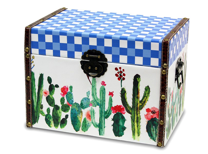 Caja en forma de cofre de madera, decorado por fuera en polipiel con imágenes de cactus y la tapa a cuadros azules y blancos. Lleva un cierre y dos asas en los lados. Es resistente.