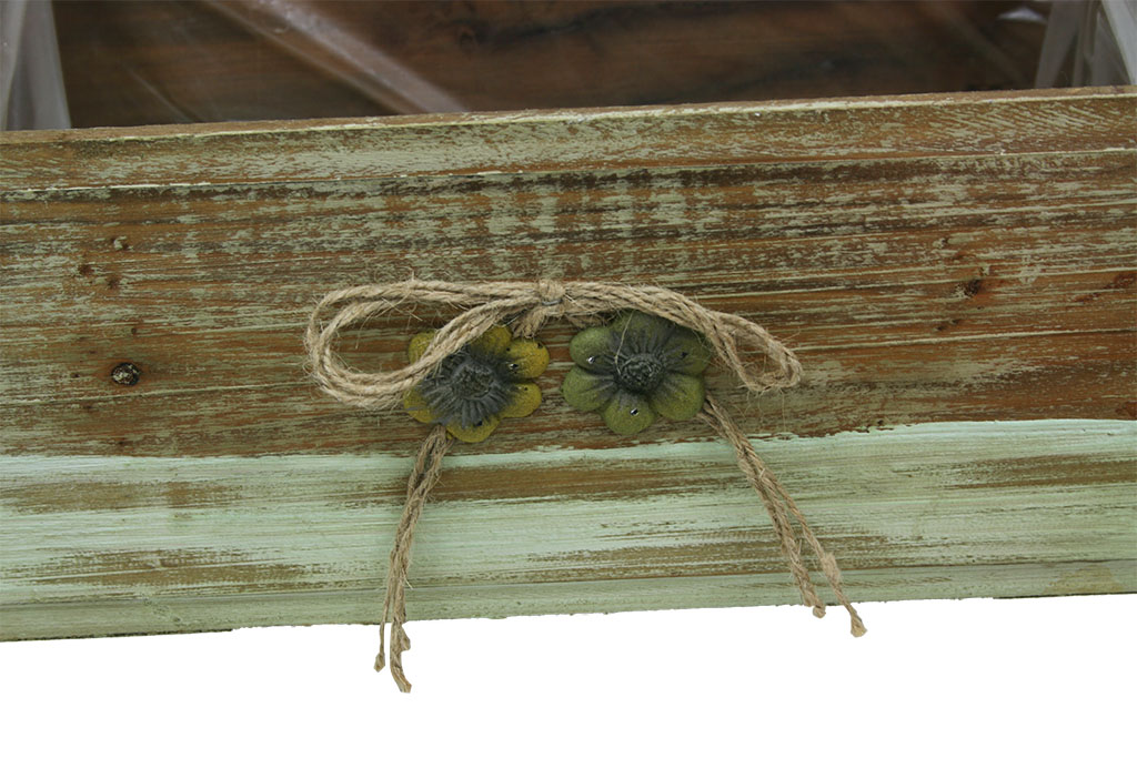 El jardín es un lugar muy importante del hogar, ya que en el se pueden vivir estupendos momentos con nuestros seres queridos. Por ello, es muy importante que el jardín tenga un bonito aspecto, para este propósito te presentamos el conjunto de CAJAS LAZO. Este macetero está hecho de madera de muy buena calidad por eso es muy resistente y tiene bonitos acabados. Por dentro está forrado con plástico transparente para evitar que el agua dañe la madera al regar las plantas. De su diseño destaca su bonito color marrón y verde con detalle de lazo de cuerda con dos flores. Este macetero de madera es ideal para la decoraciones de todo tipo de estancias y crear bonitos centros de flor. MEDIDAS: 33*20,5*14 cm, 27*17,5*10 cm y 21*14*9 cm.