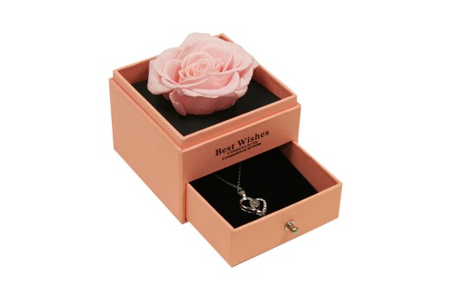 Precioso joyero con cajón coronado con una preciosa rosa preservada protegida por una cubierta de acrílico. El producto incluye una bolsa de regalo del mismo color que la rosa, la caja y una preciosa joya. La joya es plateada con forma de corazón y con un pequeño brillante en medio. Este será un precioso y delicado detalle que regalar.
