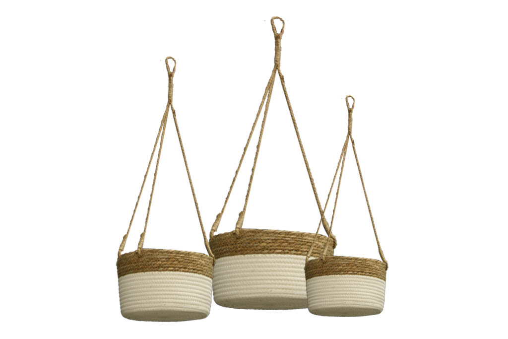 Conjunto de 3 maceteros trenzados con cuerda y seagrass. De dos colores Este conjunto será ideal para decorar el hogar con bonitas flores y plantas. Disponen de una cuerda para poder colgarlos. Estos cestos están de moda, al ser ecológicos aportan mucha naturalidad a la estancia en la que se ubiquen.