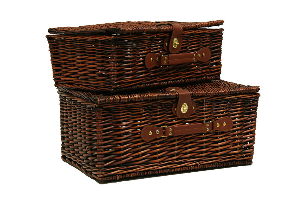 Maletas de mimbre color marrón oscuro con tapa y cierre de seguridad de cuero. Estas maletas se pueden usar para crear lotes de producto regalo o como almacenaje de accesorios o alimentos tanto en el hogar como en comercios.