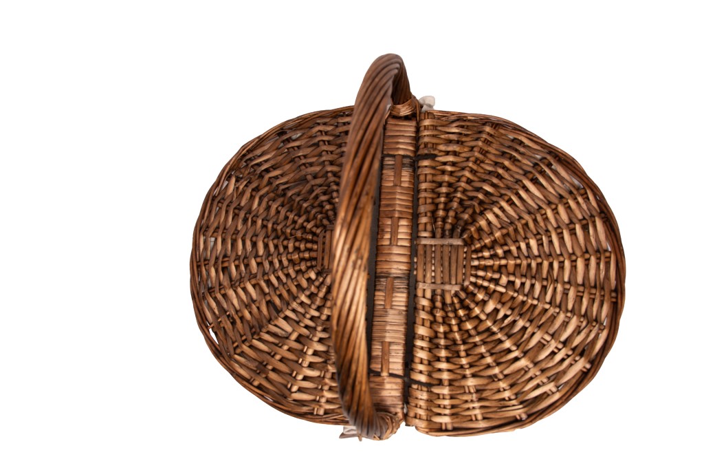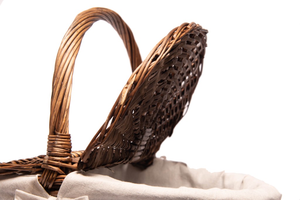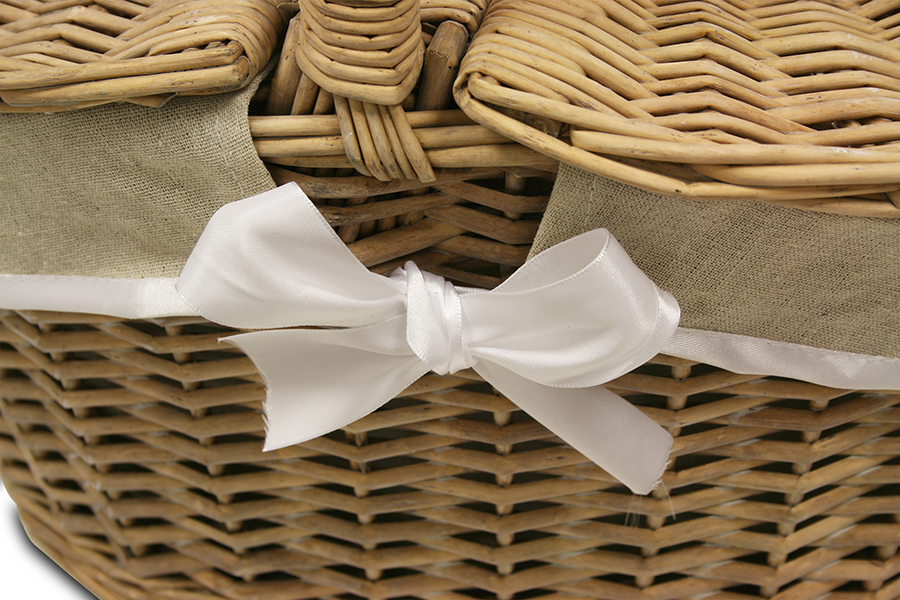 Preciosa cesta, fabricada en mimbre natural, ideal para ir al campo a comer o merendar. Tiene dos asas abatibles junto a un asa que permite su transporte. También son muy usadas en el hogar para guardar telas, artículos de coser o manualidades. Tiene el interior forrado con tela beige con el borde blanco, que se ata con dos bonitos lazos a los lados. Esta tela es extraible para su lavado. Medidas: 48×36×22 cm