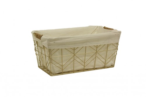 Cesta cuévano de metal forrado con tela beige, ideal para colocar la ropa sucia o como almacenaje.