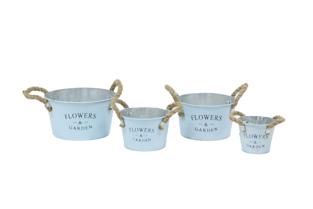 Precioso set de maceteros de metal con forma de cubo y asas de cuerda. Por dentro está forrado con plástico. Este original macetero es ideal para decoración de exterior e interior.