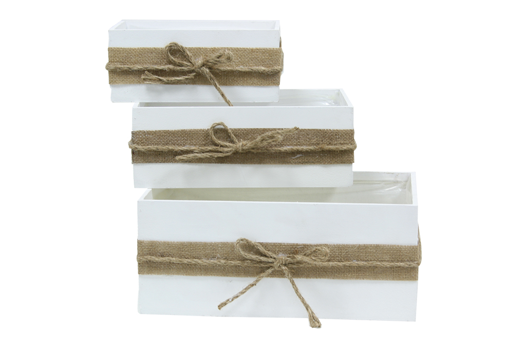 Set compuesto de 3 cajas hechas de madera blanca con forma rectangular, tienen bonito detalle de lao de cuerda y decoraciones en tela de saco. Su diseño es desgastado lo que le da un toque rústico. Al tener el interior forrado con plástico es ideal para usar como macetero, decorando estancias de exterior. Medidas: 33*20.5*14 / 27*17.5*10 / 21*14*9 cm.