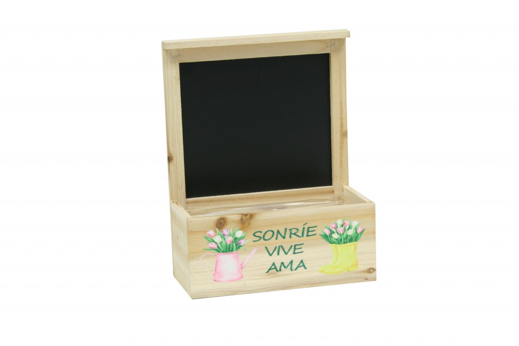 Bonito macetero de madera y pizarra con detalles de florecitas. Está forrado con una lámina de plástico. Ideal para almacenaje y decoración del hogar.