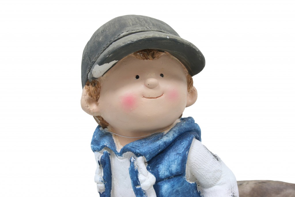 Macetero hecho de cerámica con forma de niño. La carretilla que lleva en la mano es el soporte donde se colocan las flores y plantas. Macetero con un diseño original, ideal para colocar en el jardín, patio o porche, incluso para floristerías que quieran adornar o vender como regalo para los amantes de las flores. Medidas: 34*19*39 cm