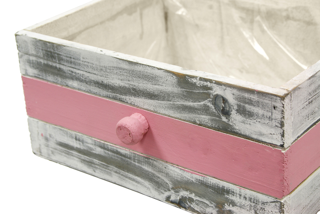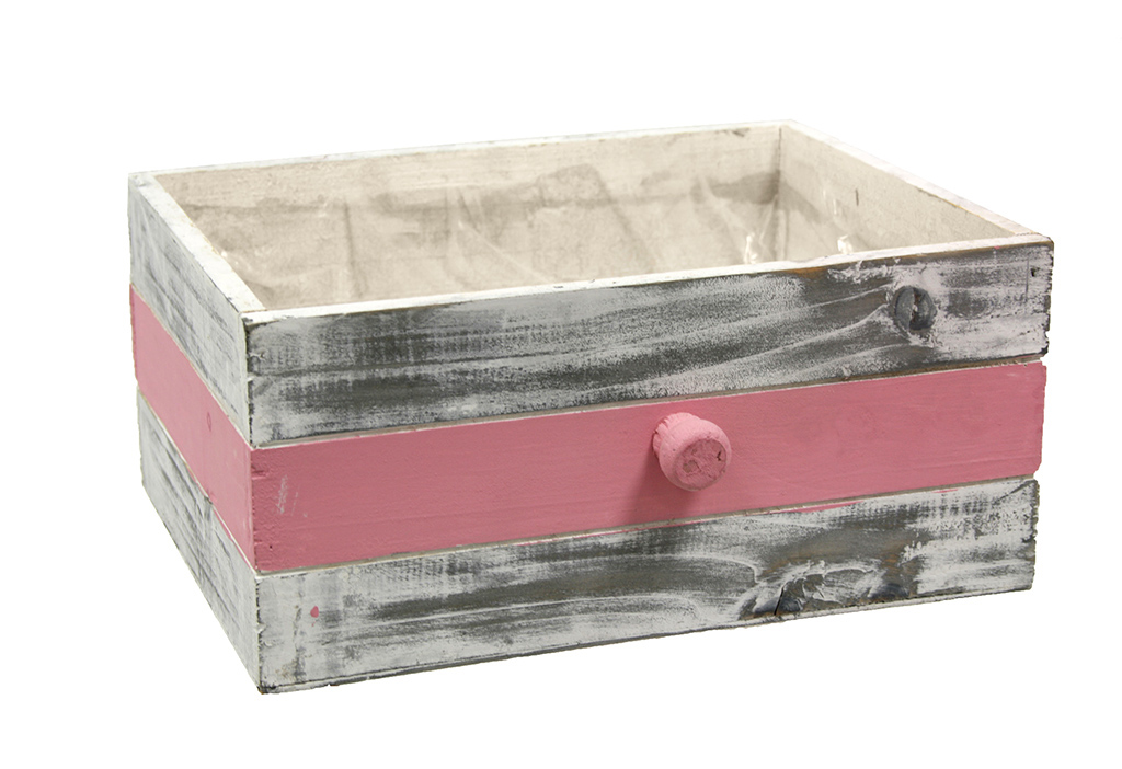 Caja hecha de madera con forma de cajón con detalle de tirador. Esta caja es ideal para usar en el hogar como almacenaje de ropa o accesorios. Su diseño combina el color blanco desgastado con una franja rosa en el centro que recorre todo el cajón. Su interior está forrado con plástico por lo que también se pued usar como macetero con flores. Medidas: 20*14*10 cm