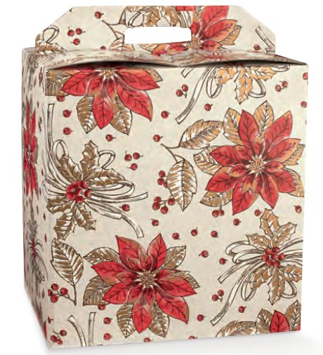 Caja de cartón desmontable con estampado navideño de nieve en colores dorados y plateados sobre fondo blanco. En la parte superior tiene un asa y cuatro cierres. Es resistente y duradera, soporta bastante peso. Ideal para crear lotes de productos o como regalo con capacidad para 6 botellas de vino. Una vez usada se puede desmontar y ocupa muy poco espacio. Medidas: 43x24x34 cm