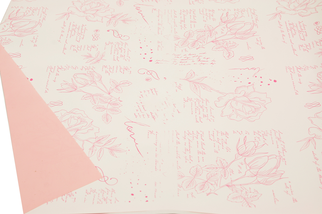 Bonito y práctico rollo de envoltorio transparente para flores y ramos con estampado en tonos rosas y detalles de flores. Este envoltorio es ideal para decorar y presentar preciosos ramos de flores y arreglos florales con un original toque de color.