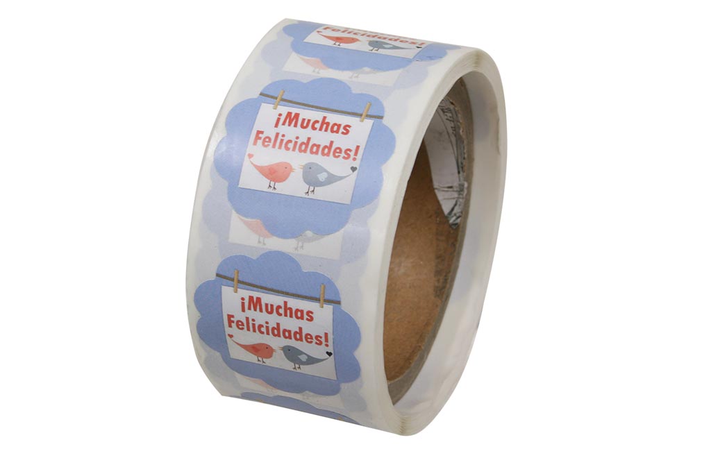 Rollo de sticker para adjuntar a tarjetas de regalo con dedicatoria "Muchas felicidades".